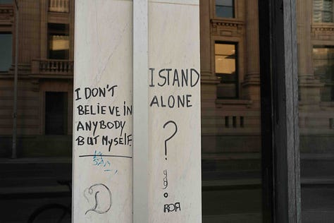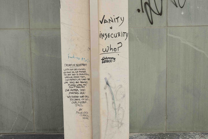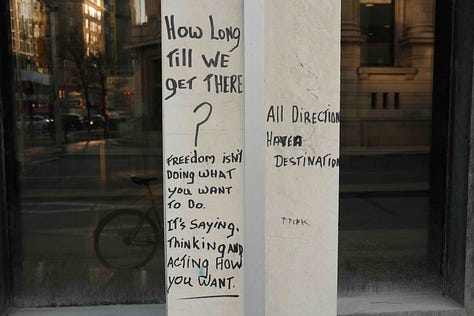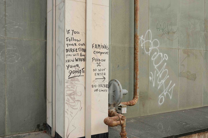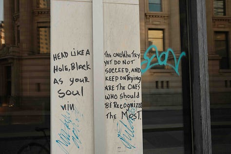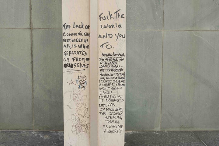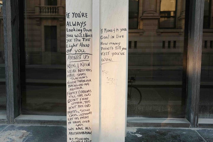 This was one of the many lines that stuck out to me written onto the pillars of the building I passed by at the corner of Garry and Main Street (I like to think of it more as an ad-hoc outdoor poetry exhibit).